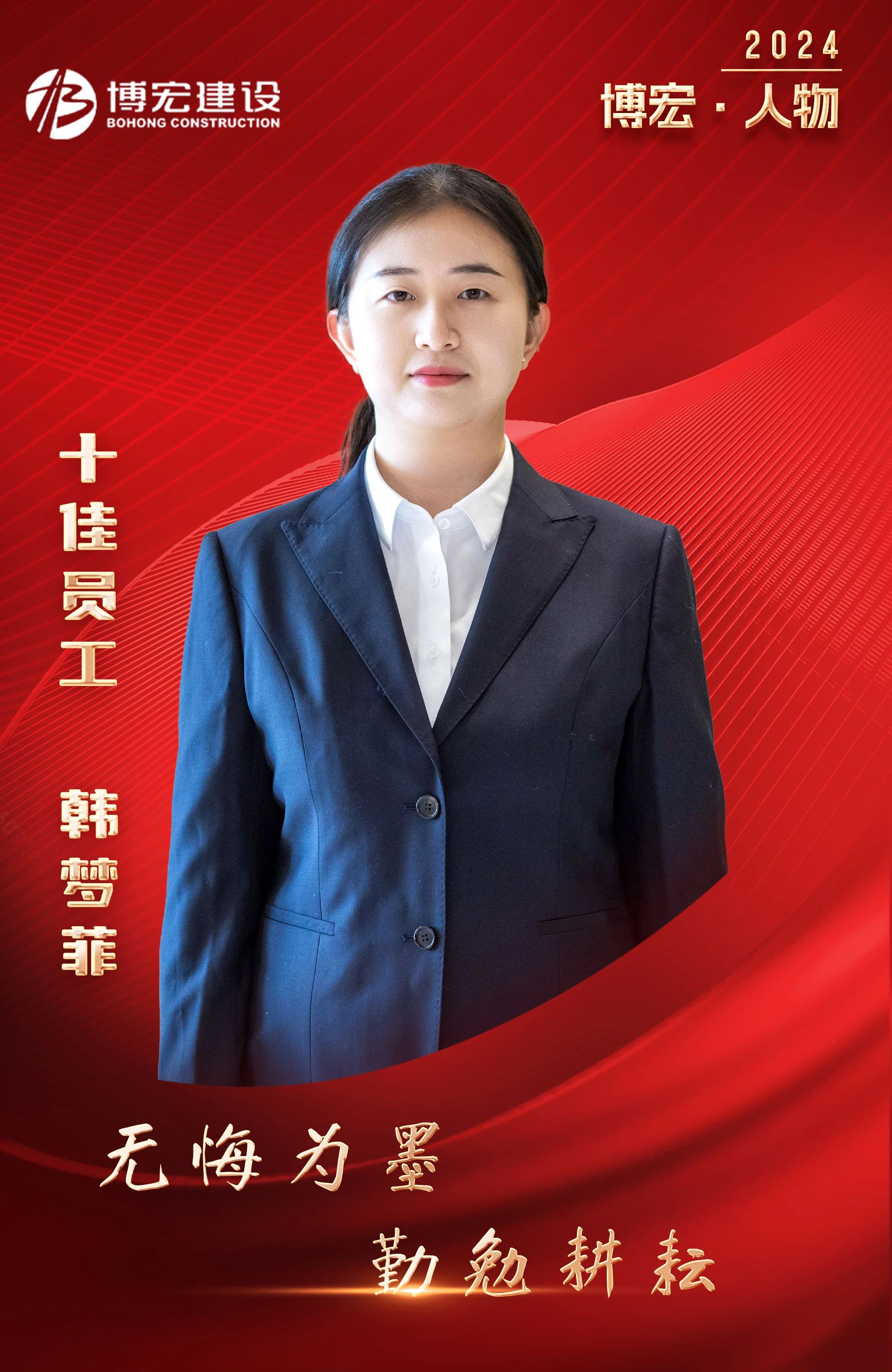 韓夢菲,黨建宣傳崗,入職博宏近2年,主導(dǎo)策劃了多次專題宣傳活動,讓宣傳思想工作更有滲透力、說服力、吸引力,逐步成長成為宣傳思想文化戰(zhàn)線上的骨干,榮獲博宏建設(shè)集團(tuán)2023年度“十佳員工”。從宣傳專員到黨建專員,崗位轉(zhuǎn)變,但服務(wù)業(yè)務(wù)部門,為公司賦能的初心不變。
